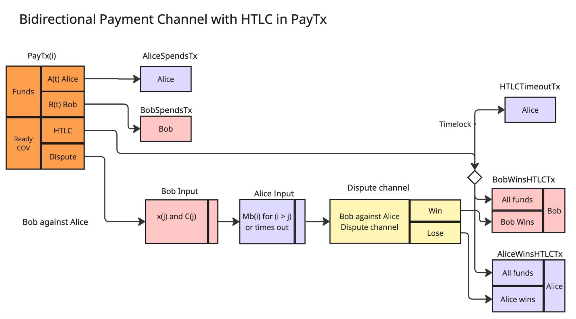 When Alice wants to unilaterally close the channel, she can only do so by signing the sequence number i using a one-time signature (OTS) scheme. This sequence number defines the state that Alice claims should determine the final balance distribution between her and Bob. If Alice uses an outdated state—say she signs j, with j < i—a dispute mechanism is triggered to penalize her. Bob simply needs to present the OTS-signed value j and the Schnorr-signed message “I revoke all states prior to i,” which Alice previously issued and which Bob has stored. A Bitcoin script verifies the OTS signature, while a RISC-V program executed via BitVMX verifies the Schnorr signature and checks whether j < i. If this condition holds, Bob wins the dispute and can claim all funds in the channel.