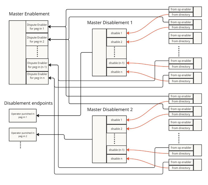 transactions, so it can trigger all disablement with the publication of a single transaction. However, for every peg-in there is a new need for a master disablement transaction, and all the dependent disablement txs. for each of