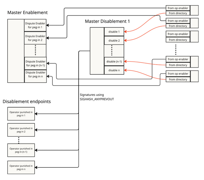 outputs must be burned at once. This is done by all operators pre-signing a long list of disablement transactions, one for each enablement output. A single master disablement transaction (or directory) connects to all disablement