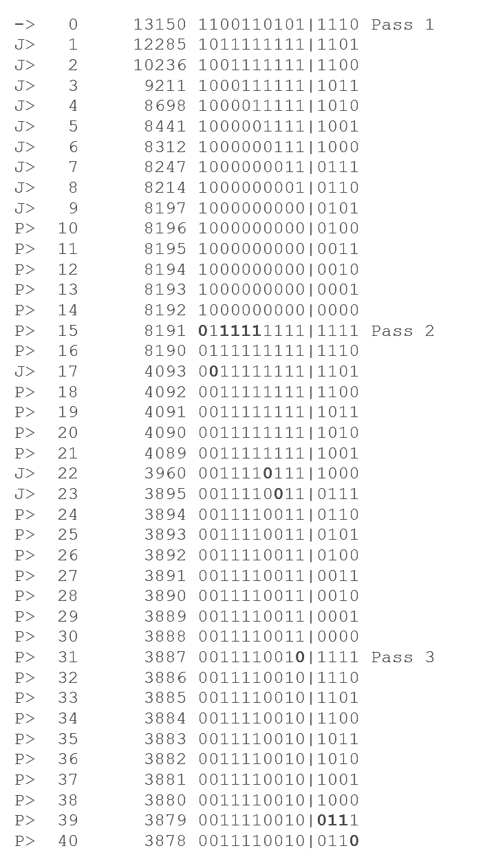 The following trace shows the path from step 13150 (binary 1100110101|1110), to step 3878 (binary 0011110010|0110). The pipe is used here to indicate the separation between the data bits from the counter bits. In the trace lines, the letter “J” indicates that the long jump was taken to reach that step, and “P” indicates the prior hop is a short jump (the step plus one). Next in each trace line is the number of hops in the path so far, followed by the step number and the binary representation of the step number.