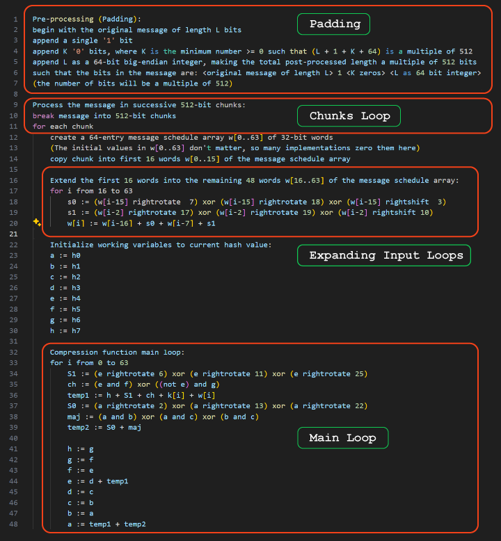I have used this hashing algorithm many times in the past, but I had never needed to understand how it works internally. Fortunately, it's not very hard, and there are plenty of resources available. Wikipedia provides a pseudocode that is easy to follow, and there’s also this awesome page https://sha256algorithm.com/ that allows you to execute the algorithm step by step and observe all its internal values.