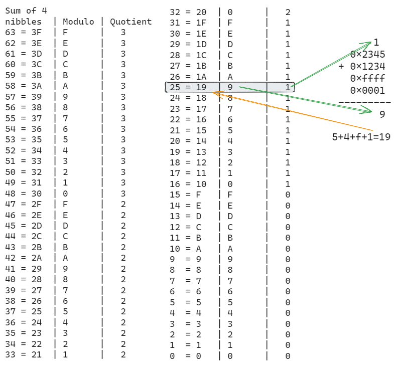 I then need two tables: one for a number modulo 16 and one for the quotient of a number when dividing by 16.