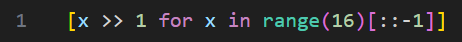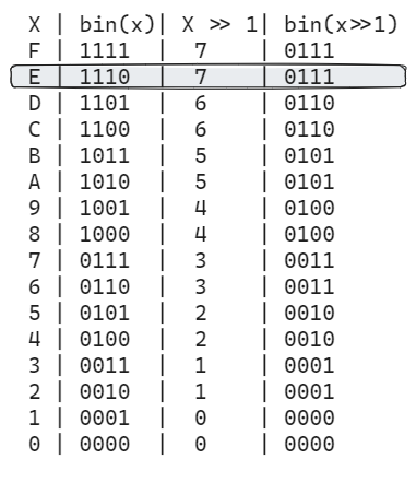 So, we can pre-calculate the table of results for shifting each nibble value from 0 to 15 to the right by 1 bit. The table can be easily generated in any language; I used Python for simplicity: