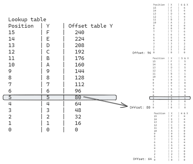 This method was ok, but I wanted to achieve shorter lookup codes so I decided to try something else. The next approach was to use 16 tables of 16 elements, plus a second lookup table. The idea is that each of the 16 tables contains the result of a specific Y value against the 16 possible X values. The second lookup table contains the offset of each of these individual tables.