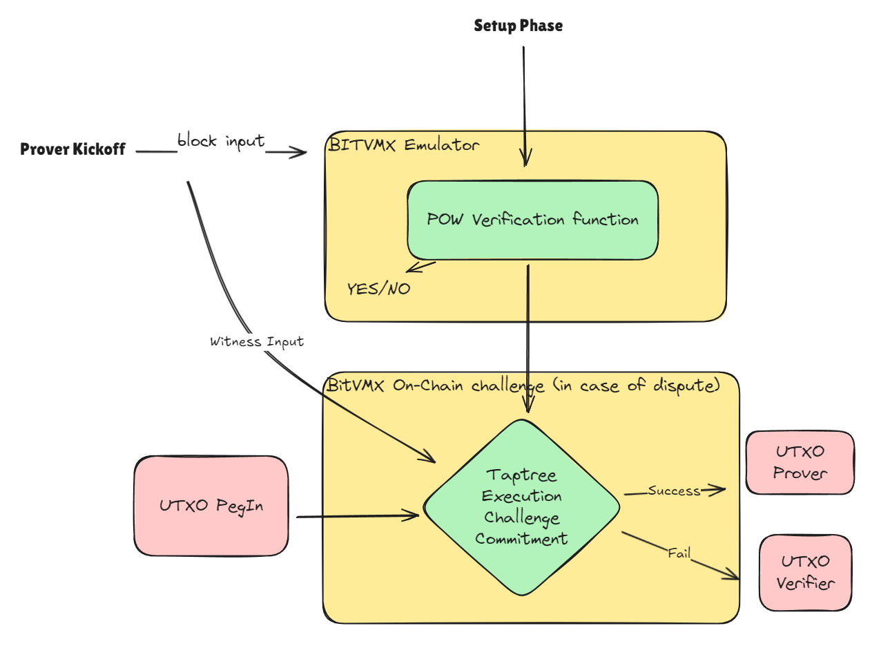 BitVMX leverages zero-knowledge proofs (ZKPs) to enable two parties to verify the correctness of computations off-chain while allowing challenges to be resolved on-chain. By combining BitVMX with RISC-Zero, we achieve a solution that ensures security and efficiency for complex verification tasks on Bitcoin.
